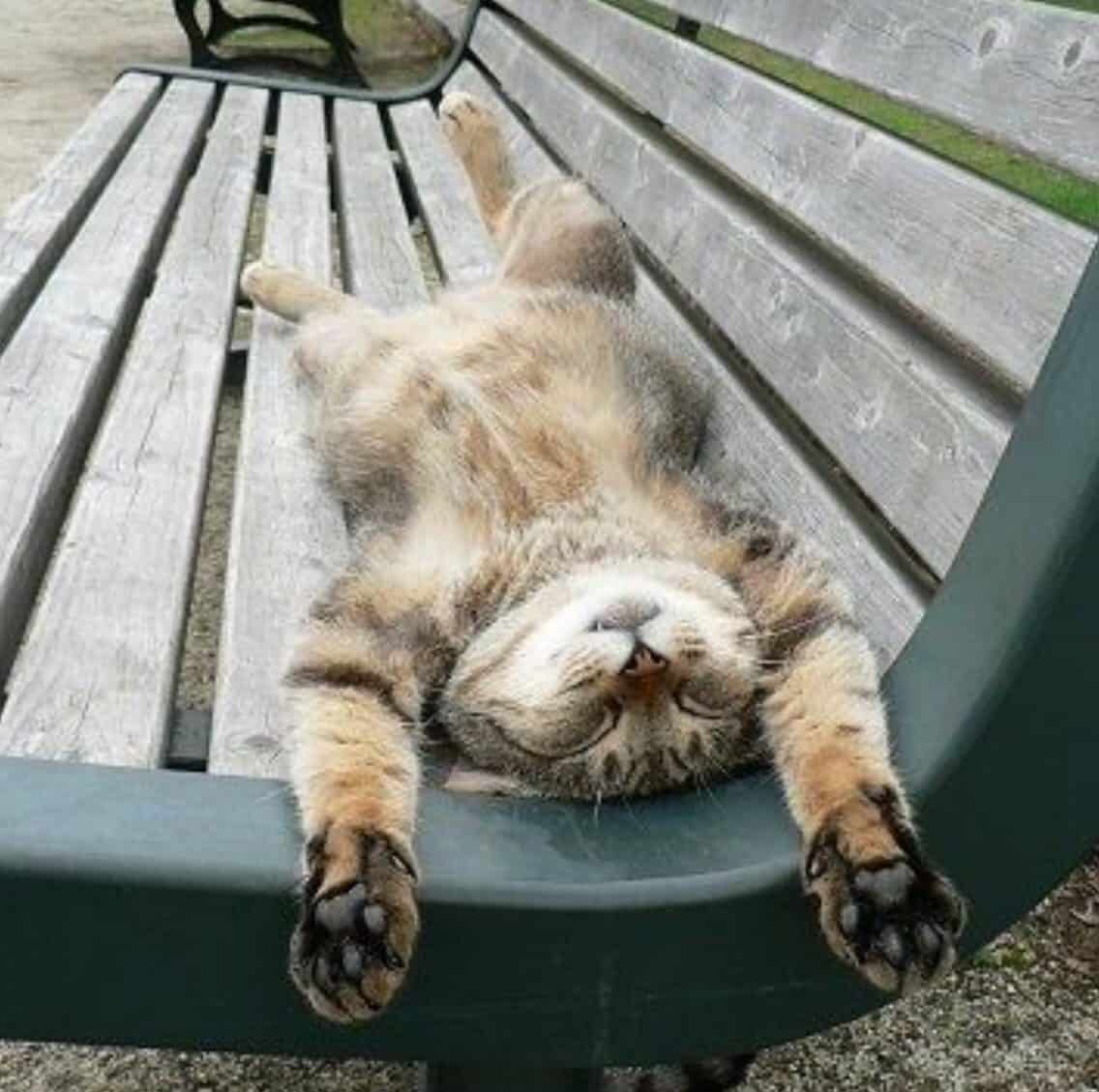 3. When it comes to bus seats and park benches, we all hope and pray no strangers sit next to us. One feline solved this issue simply by stretching out as far as possible across her bench. Good luck trying to fit anyone else on there!