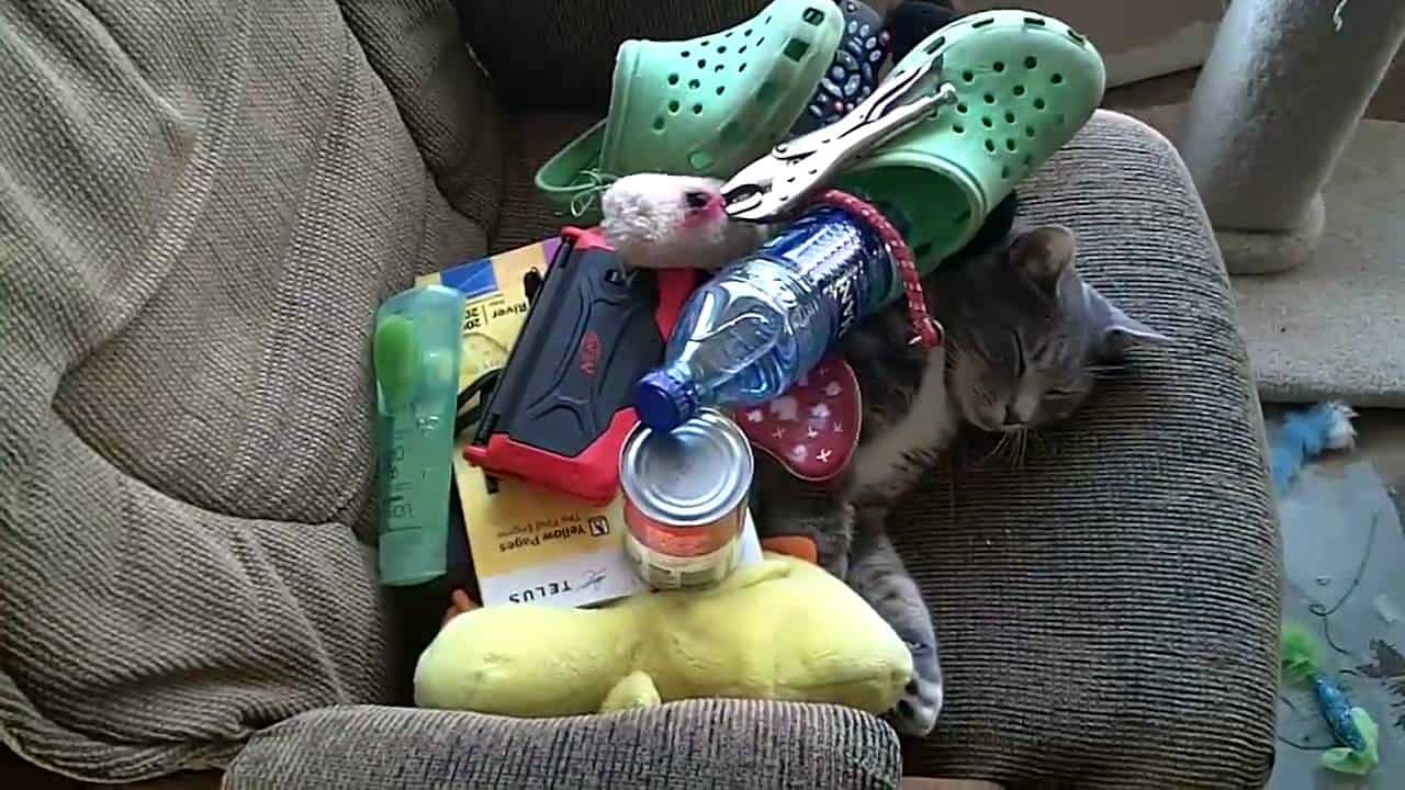 1. There isn’t any kind of award for ‘”Heaviest Sleepier,” but this cat would certainly win it if there were! Her owner stacked all kinds of doodads on top of her, and somehow she seems even more comfortable than before.