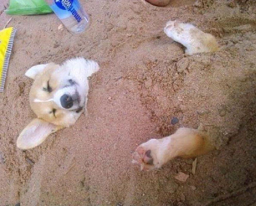 4. If you looked up “beach bum” in the dictionary — we know it’s probably not in there, but stay with us — you’d likely find a picture of this delighted corgi. He couldn’t be any happier to be buried in the sand, though he’s bound to get some interesting tan lines!