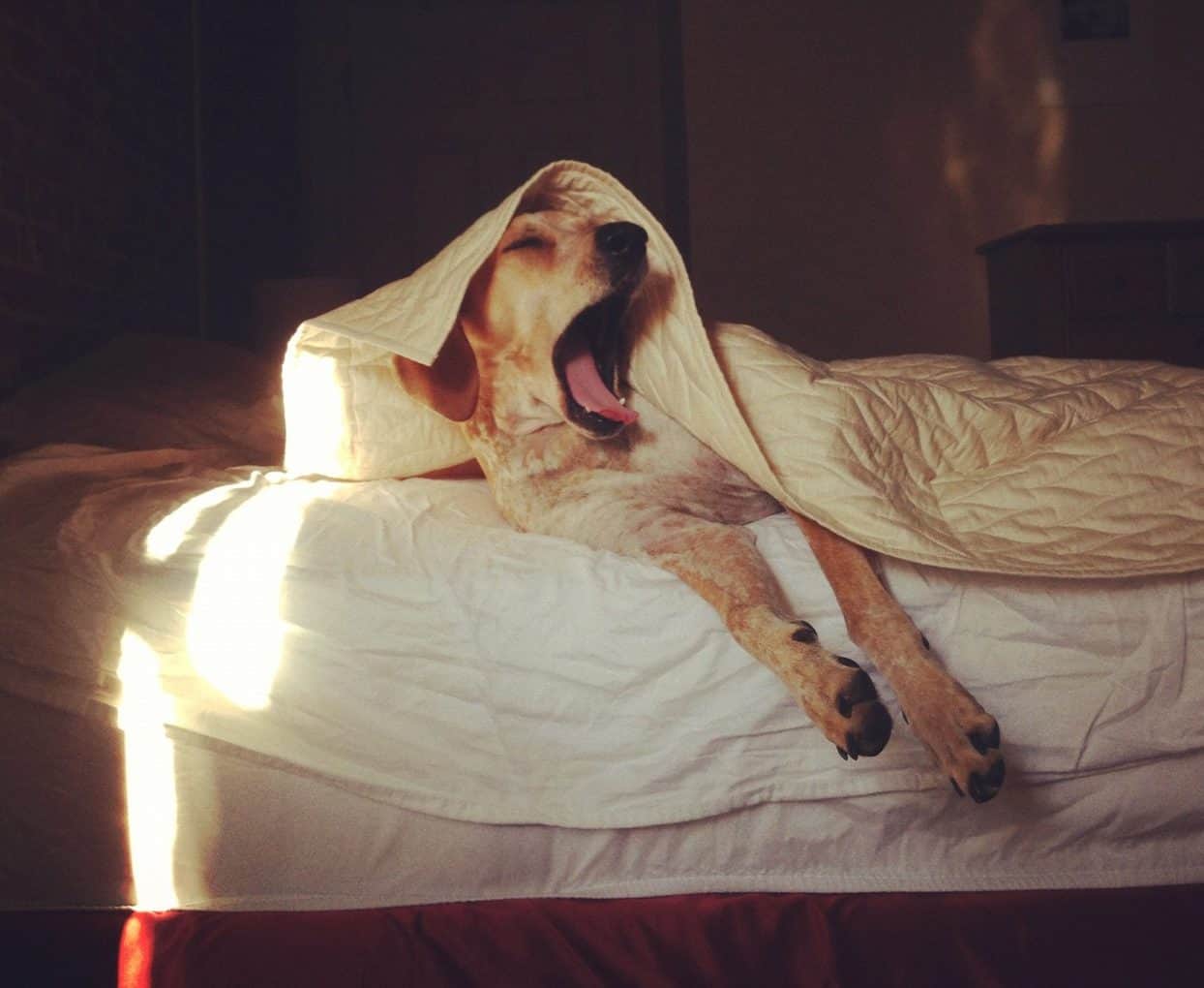 5. Just about everybody struggles to wake up in the morning, but one canine has a little extra trouble. He’s so worn out he won’t even come out from under the covers! Hopefully he’s not a service dog because he is NOT making it into work on time.
