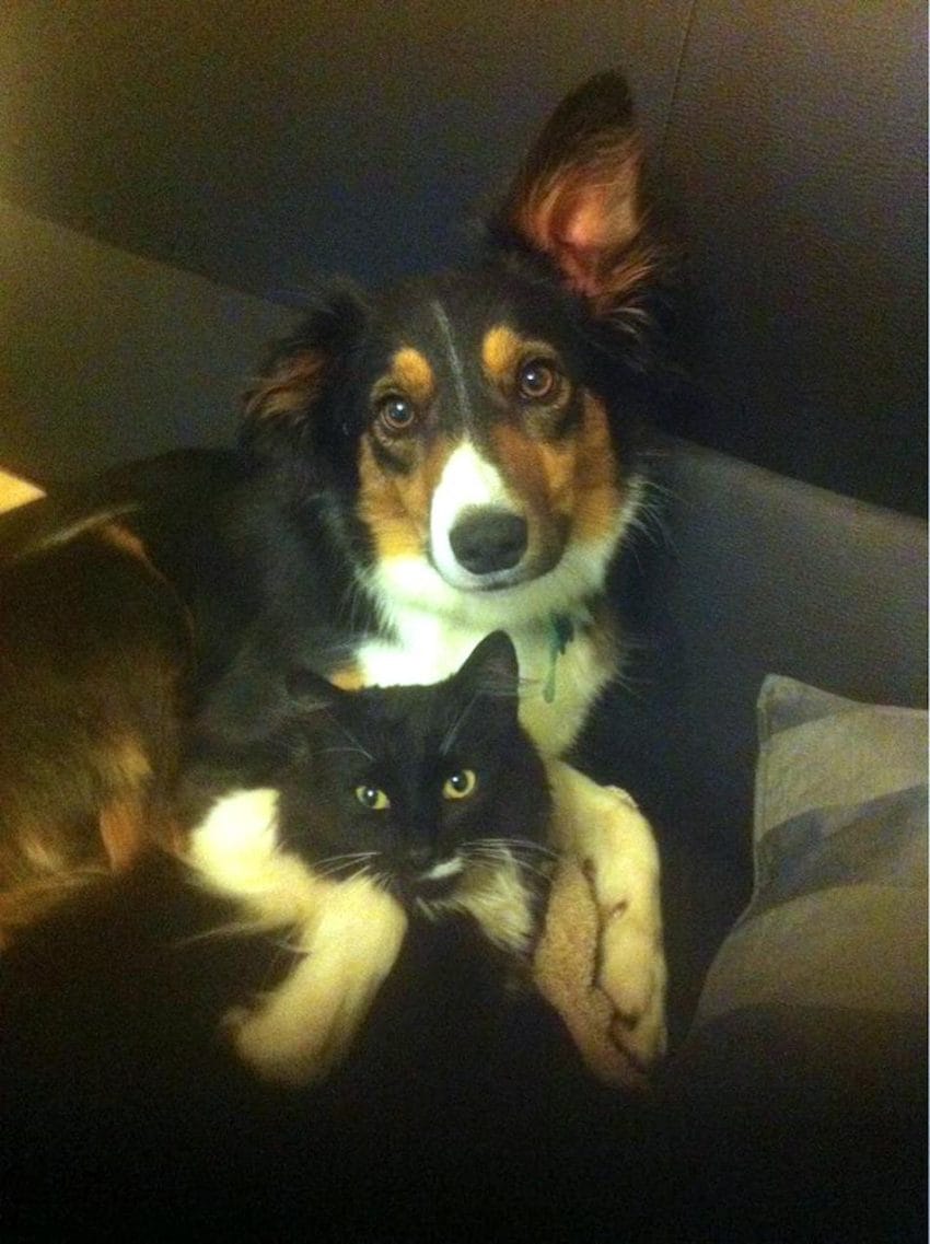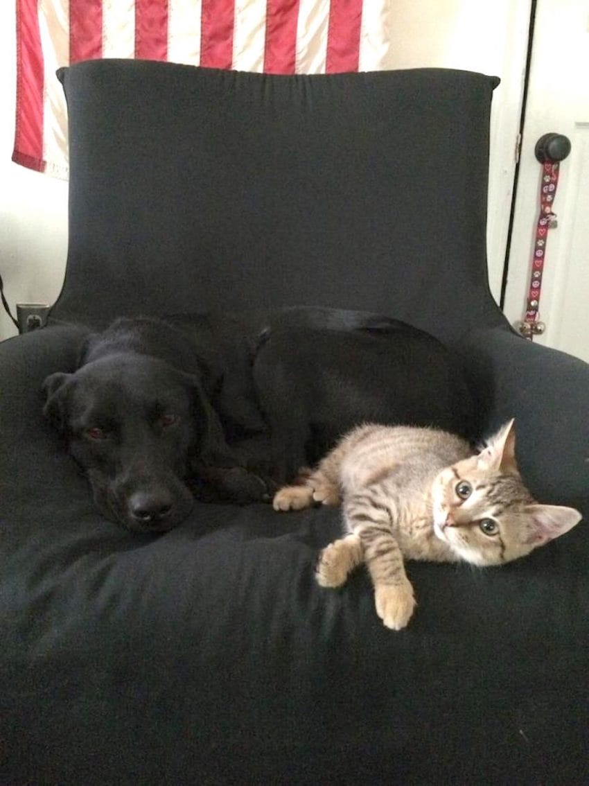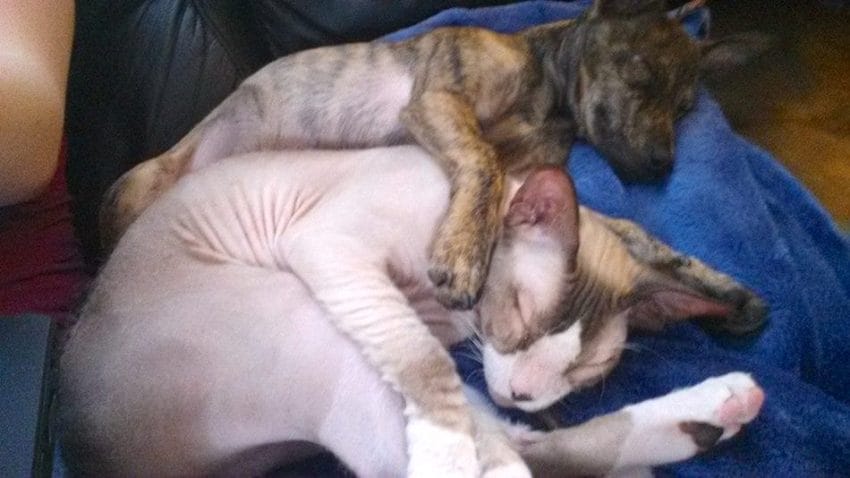 This cat and dog are almost exactly the same size, making them the perfect cuddle buddies!