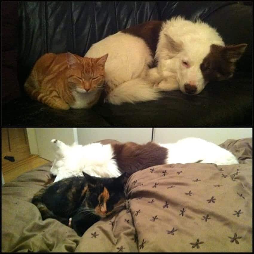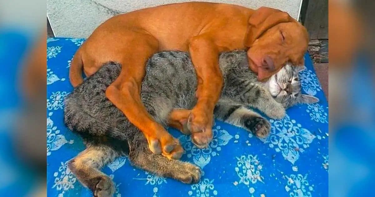 Cats and dogs can form strong bonds, and they show that bond by cuddling. Here are some adorable examples of cats and dogs who love curling up together!