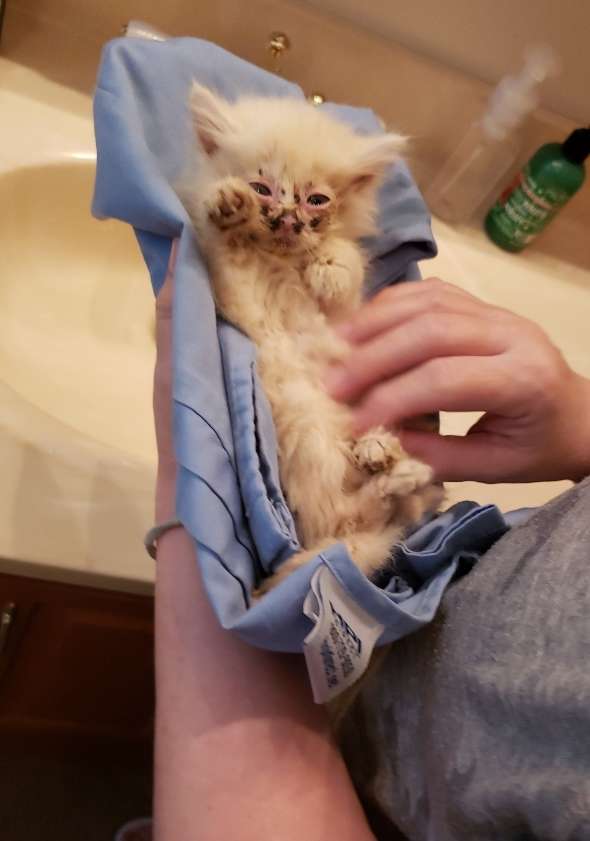 “We gave her a bath in the sink to try to clean her up a little bit, and then we turned on our space heater and let her rest in front of it because she was shivering and cold,” Gerth said. “She ended up falling asleep in my hand for about 45 minutes in front of the heater.”