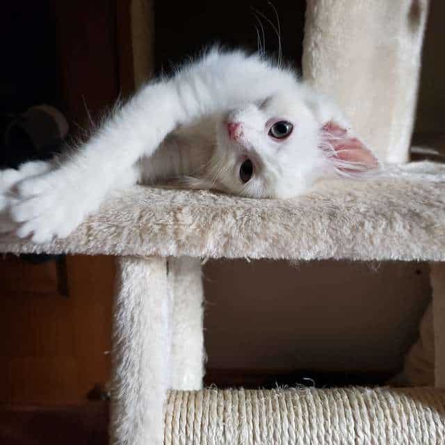 Nimbus was barely opening her eyes as a tiny kitten when she met Sam Gerth. The white kitten was found by his girlfriend, covered in oil and dirt from the road while she was coming home from work.