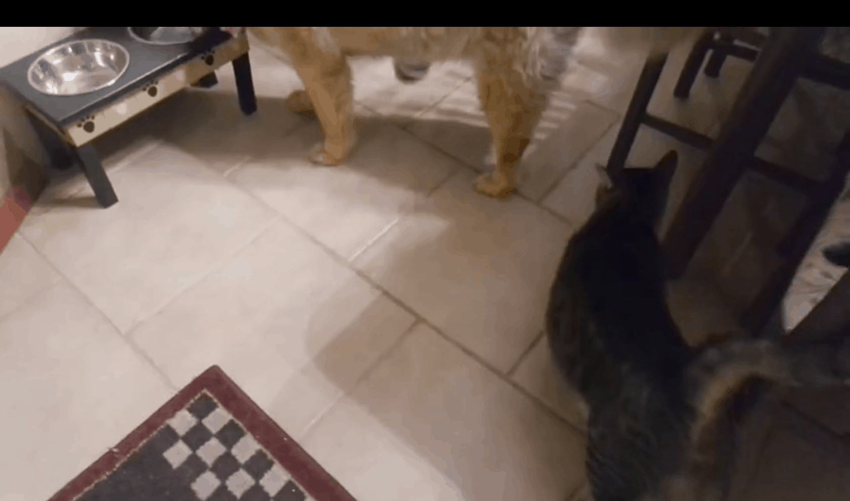See Jasper’s reaction when he is finally reunited with his canine buddy after about a month or so, he is so pleased to see him and follows him around the room. How delightful to watch this cat and dog share a head bump as a sign of friendship and trust.