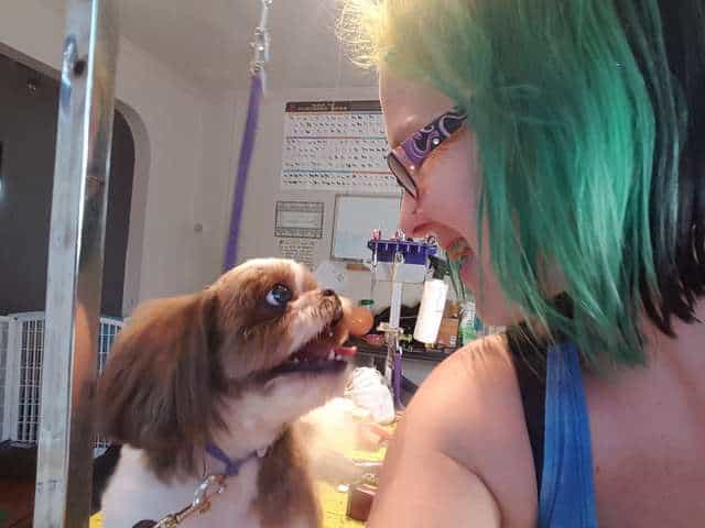 You know when kids are surprised to see their teachers out in public as if it’s weird that they have lives outside of the classroom? That must’ve been what it was like for this dog to see her groomer while out and about! I mean, the look on Muffin’s face said it all.
