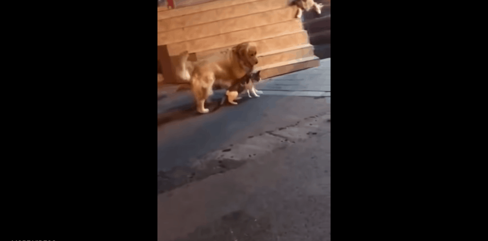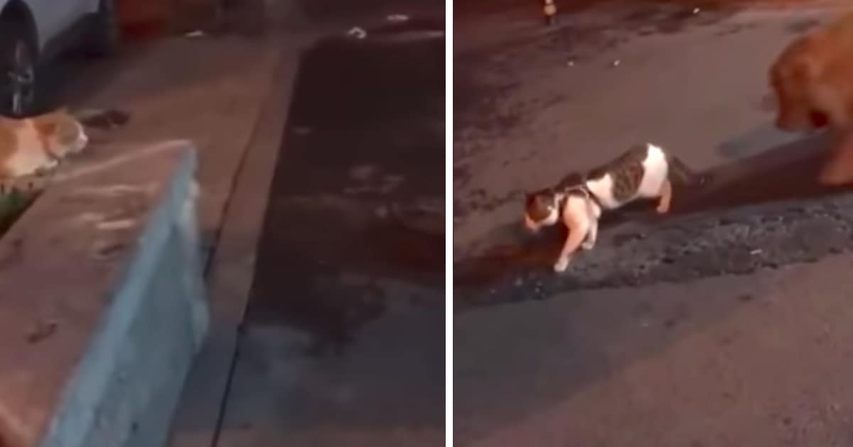 It starts by showing a cat wearing a harness who’s approaching another cat on the street, and they’re both hunched down with intent to pounce if and when necessary. Well, a potential fight never happens thanks to a quick-thinking Golden Retriever. The dog comes up from behind and grabs the kitty by the harness and takes him away so that there’s no brawl.