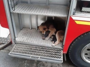 As they stood there, Amanda went back and forth from the house to the firetruck, which she had marked as a safe place for her puppies.