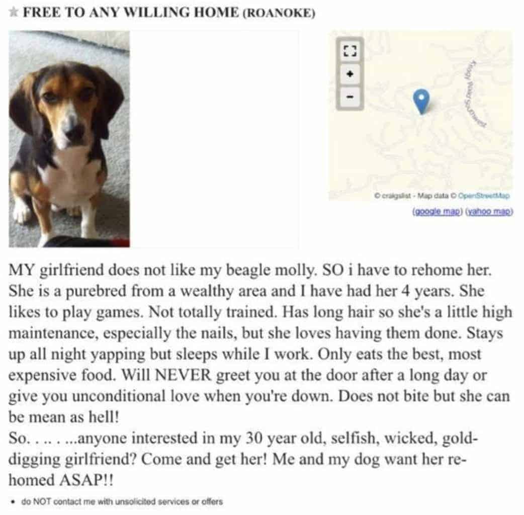 “MY girlfriend does not like my beagle Molly. SO I have to rehome her. She is a purebred from a wealthy area and I have had her 4 years. She likes to play games. Not totally trained. Has long hair so she’s a little high maintenance, especially the nails, but she loves having them done. Stays up all night yapping but sleeps while I work. Only eats the best, most expensive food. Will NEVER greet you at the door after a long day or give you unconditional love when you’re down. Does not bite but she can be mean as hell!