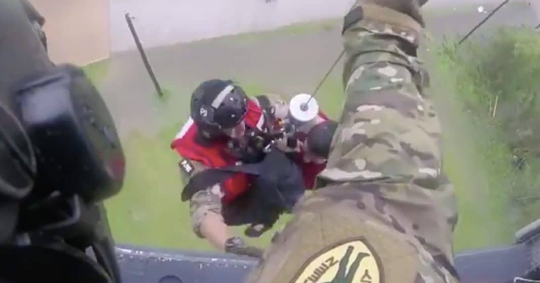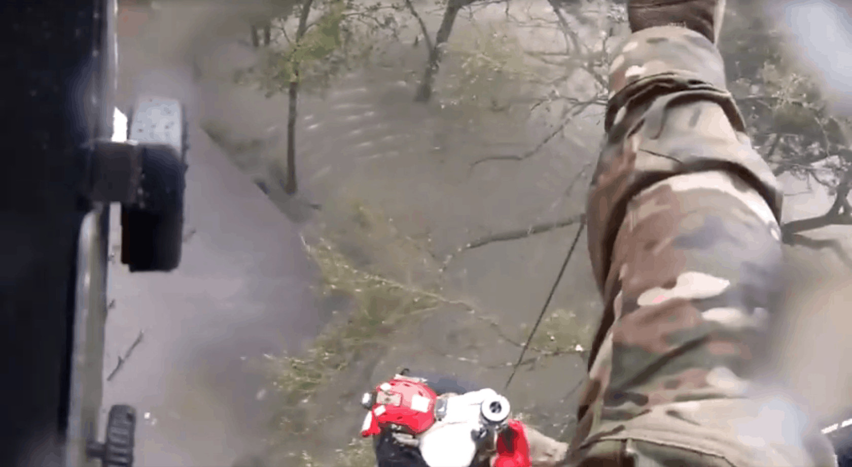 The footage shows a family of nine – including a one-month-old baby – being pulled out of the floodwaters by an HH-60 Pave Hawk helicopter.