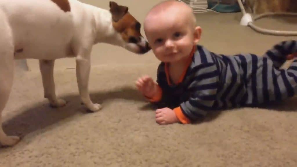 The adorable Jack Russell terrier notices the baby’s difficulty with crawling, and slowly demonstrates the proper technique. The dog drags himself across the floor and perfectly pulls himself forward using his little paws.