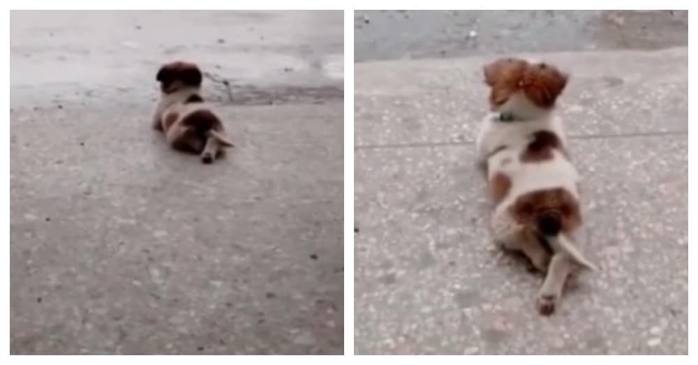A little brown and white dog was captured on video by his owner resting quietly on the ground and watching the rain. To add to the cuteness, the small pup had his back legs crossed in the ultimate relaxation move.
