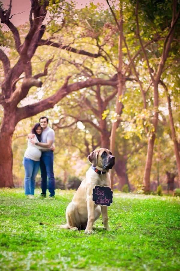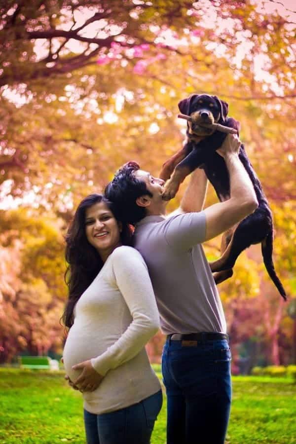 Sanjana was determined to keep her pups. So, with just a week until her due date, she arranged a maternity photo shoot with her husband and dogs, who wore signs to express their excitement.