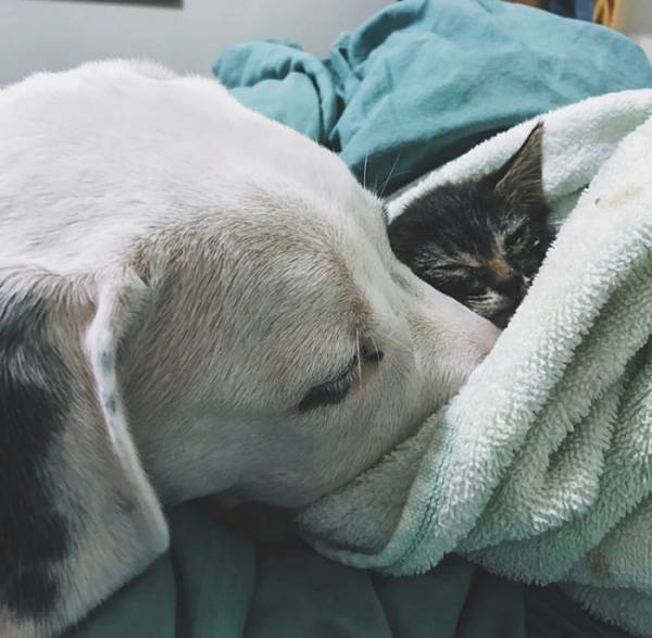 We knew that just one excited move by him could crush and kill her, and he was just a puppy himself who might not know how to behave around this tiny creature, just the size of our palms. We set her down on the bed, wrapped in her towel, and held our breath. But we were amazed by his reaction – Gatsby transformed into the most delicate and gentle dog we’d ever seen. He sniffed her, and immediately crawled close and began to lick her head lovingly. He nuzzled his nose into the towel with her, and rested her head on top of his snout, where he lay calmly and she relaxed into the warmth of his touch.