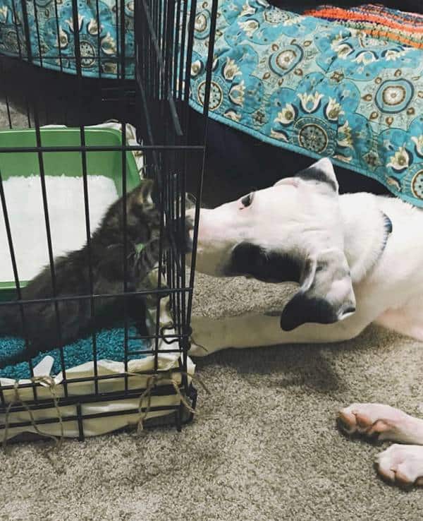 But then, our first miracle happened: we introduced this sick kitten to Gatsby – the 4-month old puppy we had just rescued from the shelter a month earlier.