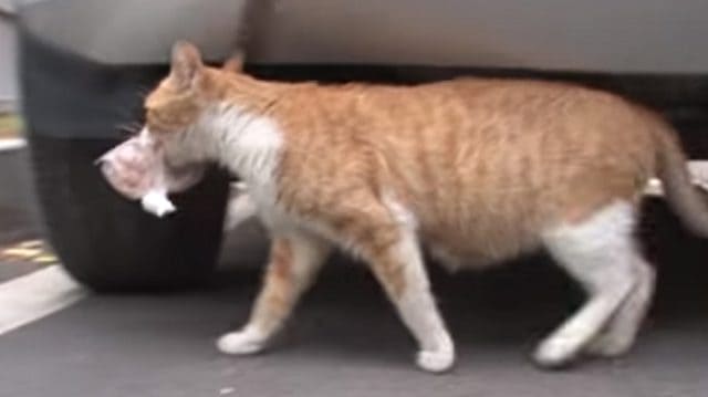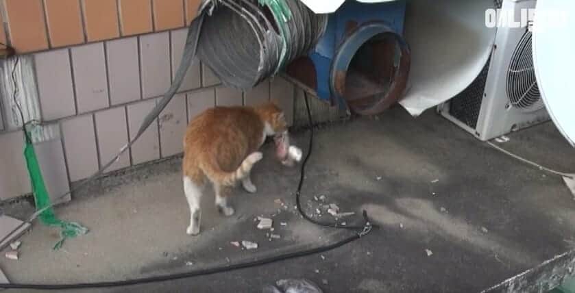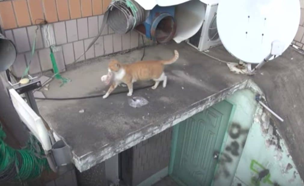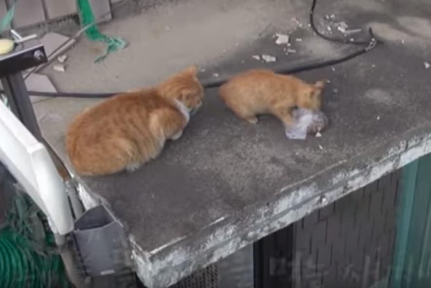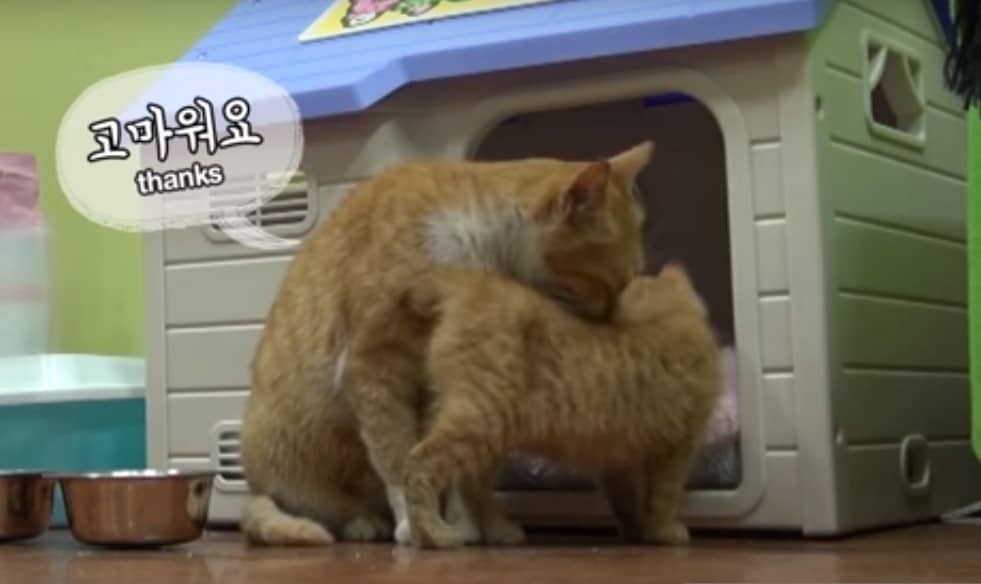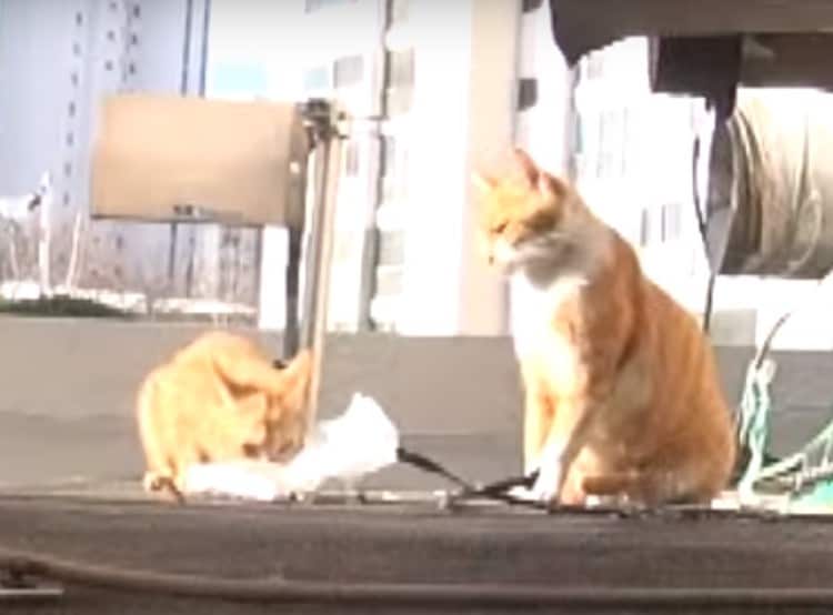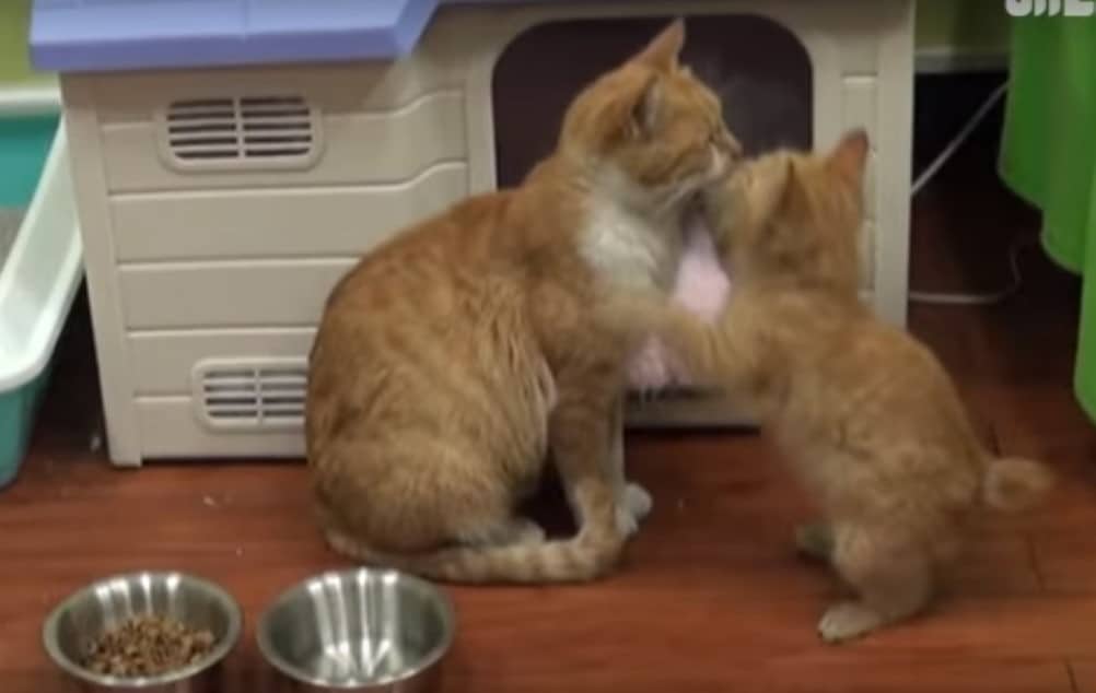 In a couple of seconds they had their answer. In response to Dongsuk’s meows, a tiny ginger kitten came scampering up to meet her. Immediately it became clear that the reason Dongsuk would only take the wrapped food was because she was a mom!