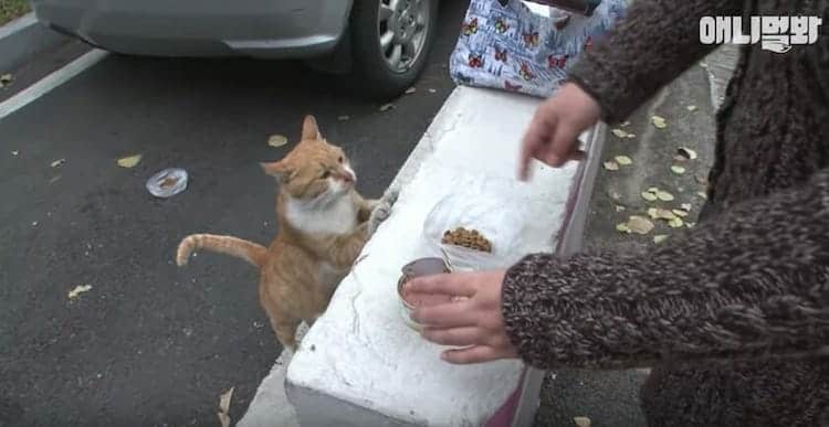 The cat, whose name was Dongsuk, appeared regularly to get her meals just like the other feral cats. However, unlike her feline friends, she turned up her nose at a bowl of fresh dry food. She just didn’t seem interested in the food if it was presented this way.
