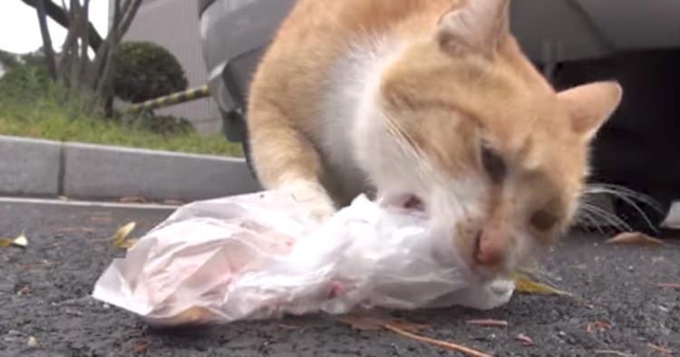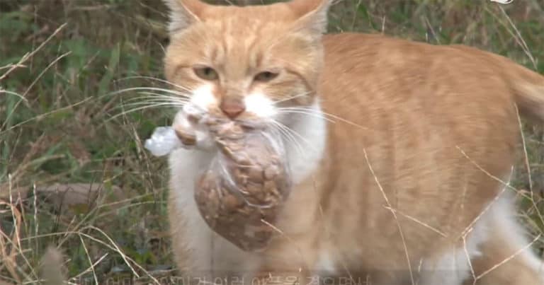 That’s when the woman decided to try something different. Instead of offering Dongsuk opened food, she decided to try wrapping it up in a plastic baggie. Sure enough, it worked like a charm! The cat immediately grabbed the bag of food and mysteriously headed off somewhere.