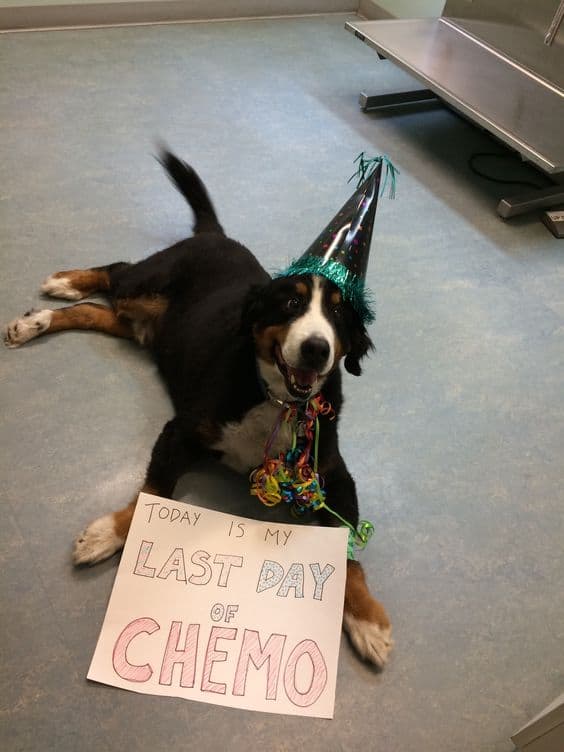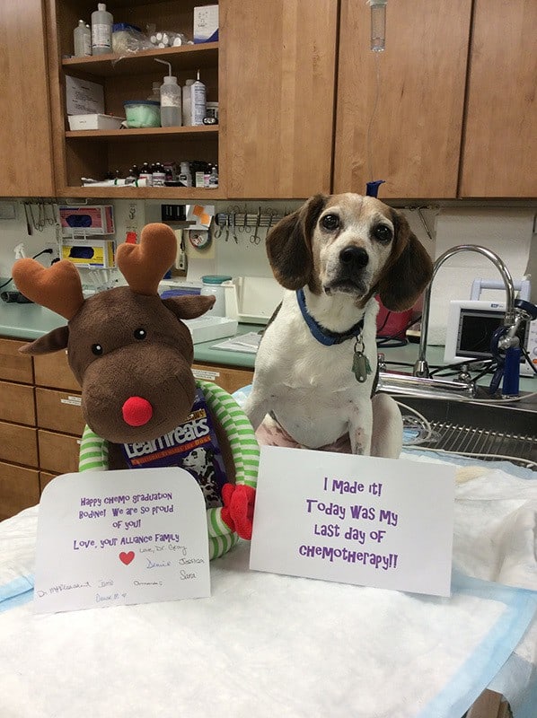 The kind staff at the Alliance Animal Hospital celebrated this dog’s last day of chemo with a greeting card and a stuffed animal. Amazing people, don’t you think so?