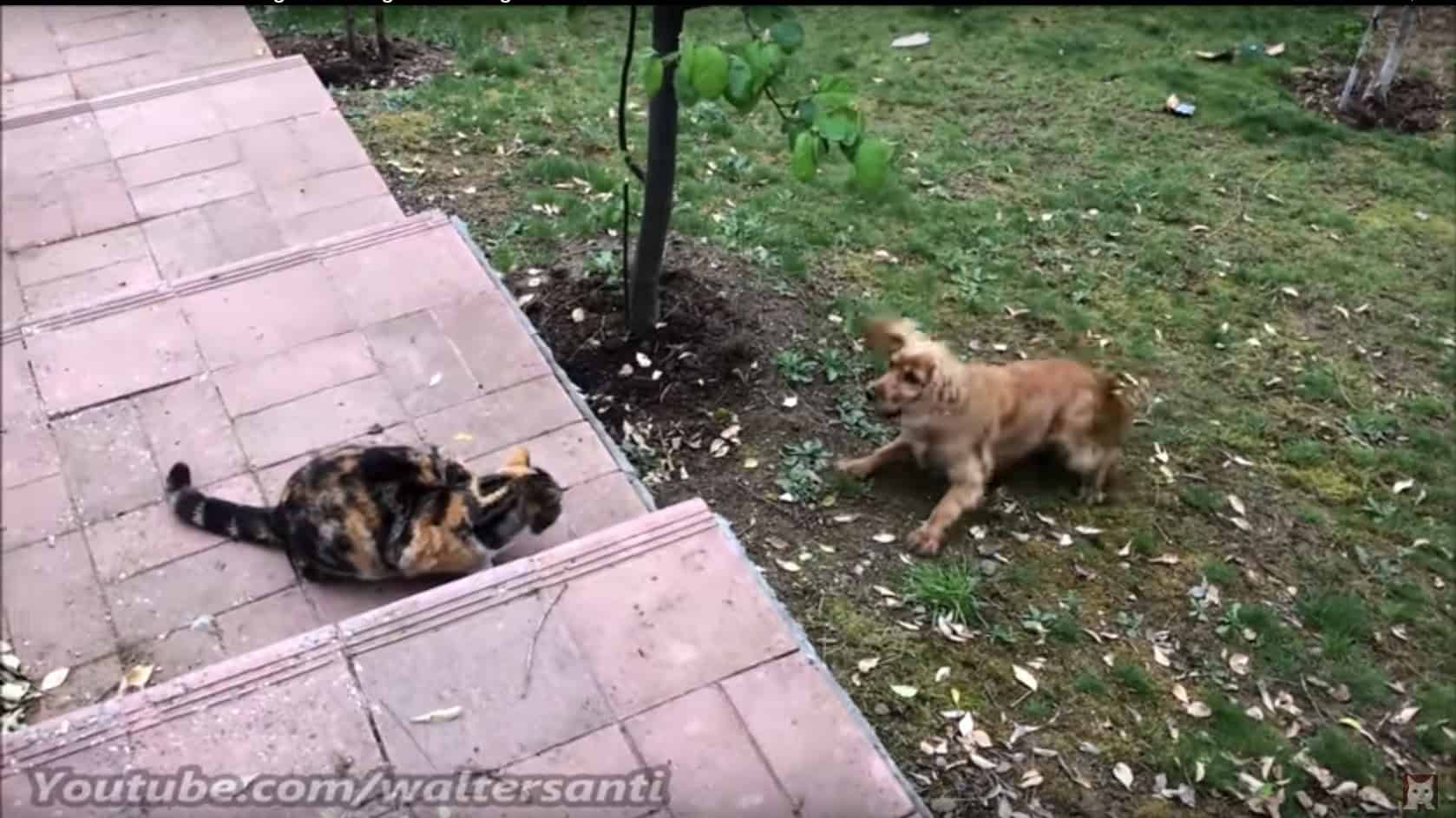 I could watch these three all day. The person filming has 2 cats who are constantly on patrol, guarding their yard from the very playful neighbor dog.