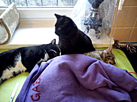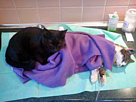 HE EVEN HUGS AND CLEANS THE OTHER PATIENTS AS THEY RECOVER FROM THEIR OWN HEALTH BATTLES. HE USES HIS POSITIVE KITTY ENERGY WHILE SLEEPING BESIDE THE OTHER FURRY PATIENTS, GIVING LOTS OF GOOD KITTY VIBES.