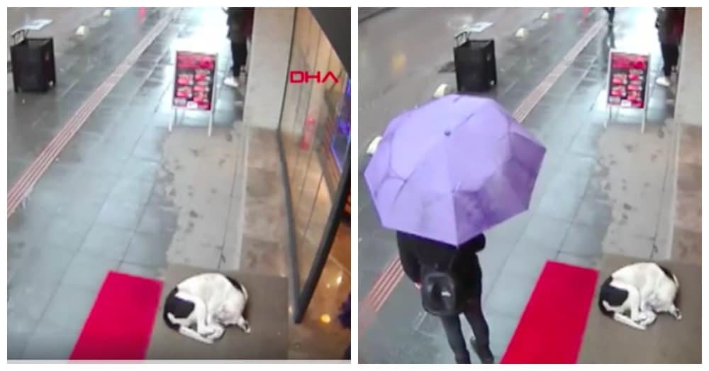 Duygu Elma was exiting a cafe in Zonguldak, Turkey with an umbrella in hand because it was a cold and rainy day. As she turned to head down the street, she noticed a stray black and white dog shivering on the sidewalk. The poor dog was attempting to get out of the rain by resting under the building overhang.