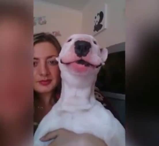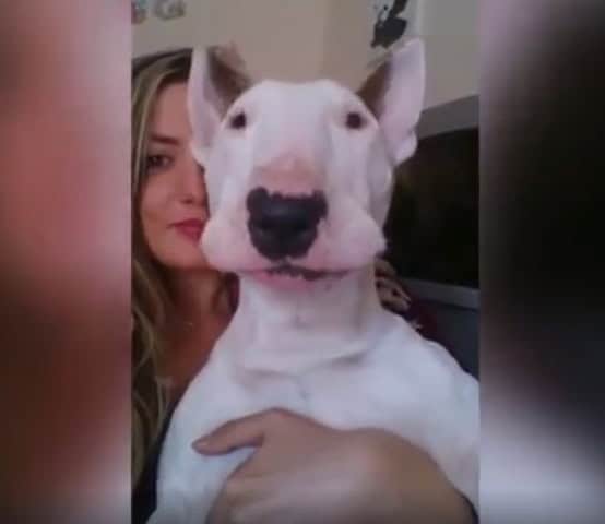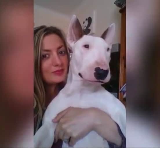 The footage shows a woman holding Lilly the Bull Terrier in her arm, saying, “Let’s sing it.”
